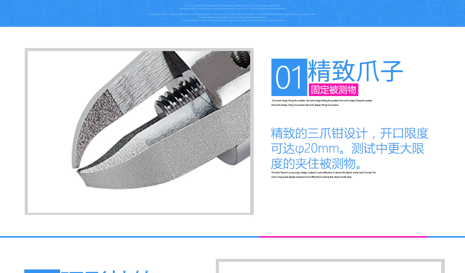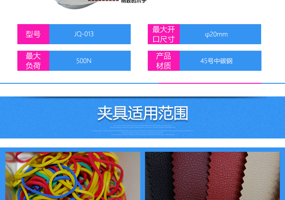 產(chǎn)品型號:JQ-013 品牌:劍 喬 用途:三爪鉗夾具適用范圍:橡膠、各種線纜、紙、各種電器元件、塑料薄膜等材料的拉力,破壞力測試。