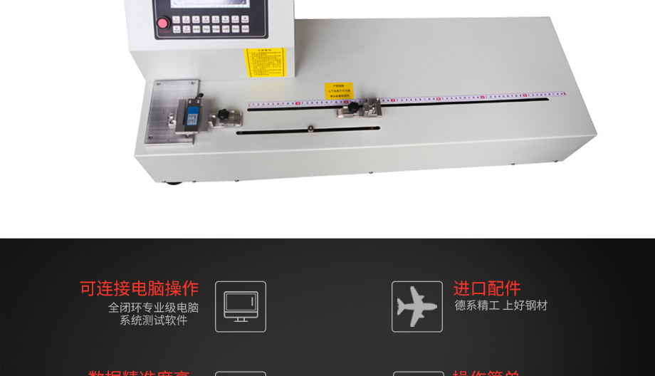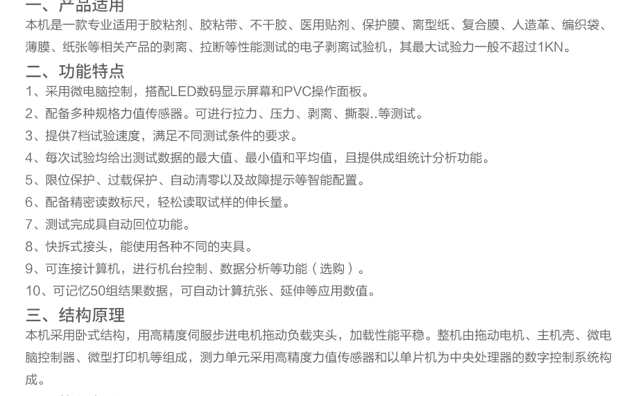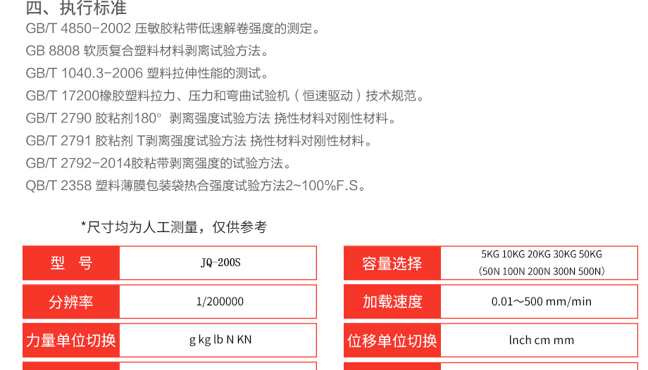 產品型號:JQ-200S 品牌:劍 喬 用途:本機是一款專業(yè)適用于膠粘劑、膠粘帶、不干膠、醫(yī)用貼劑、保護膜、離型紙、復合膜、人造革、編織袋、薄膜、紙張等相關產品的剝離、拉斷等性能測試的電子剝離試驗機,其最大試